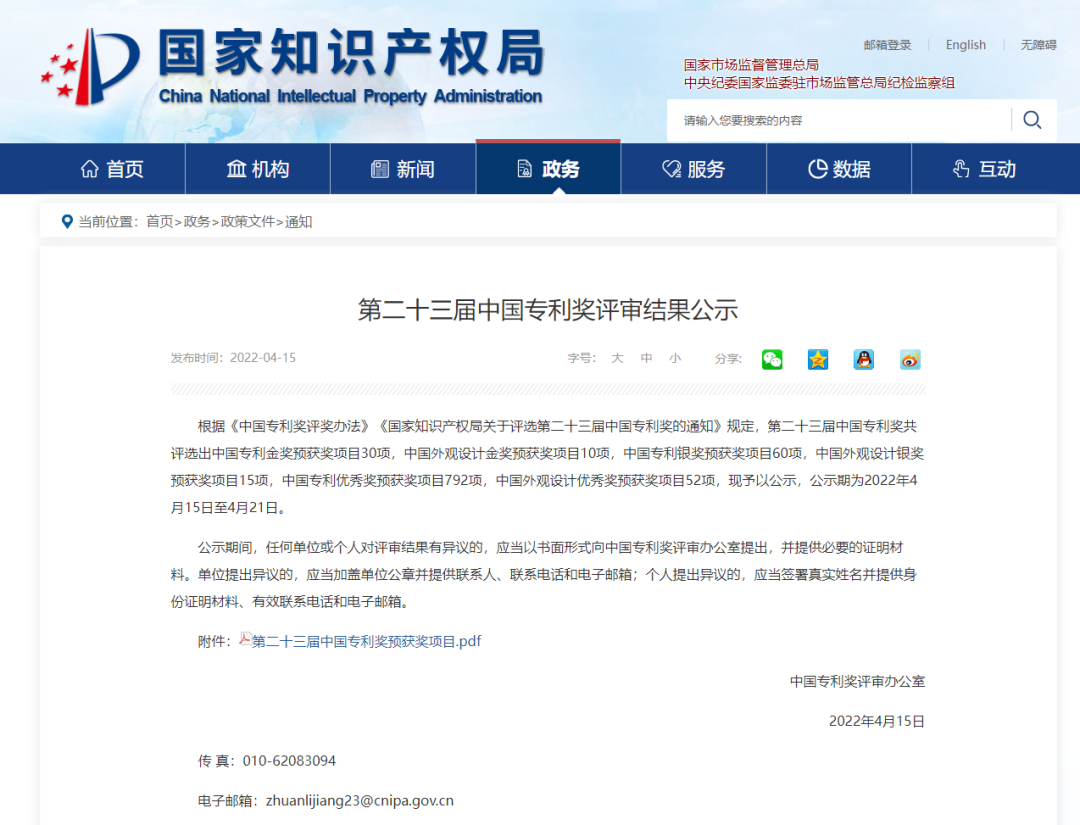 2022年4月15日国家知识产权局发布第二十三届中国专利奖评审结果,君胜知识产权代理的5项专利进入预获奖名单,其中预获奖项包括中国专利优秀奖、中国外观设计优秀奖。