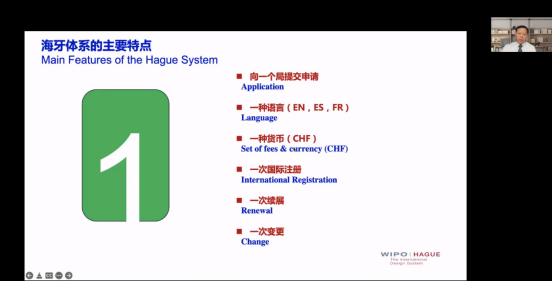 讲座首先是由吕老师为我们带来关于《工业品外观设计国际注册-海牙体系》的分享,他从法律框架、基本特征与优点、地域范围、统计数据、国际申请的费用和如何提交国际申请6个方面介绍海牙体系,其中特别强调了海牙体系的关于六个“一”的优点:1. 向一个局提交申请;2.一种语言(EN, ES, FR);3.一种货币(CHF);4. 申请只需一遍就包含所有指定国家;5. 续展只需一遍就包含所有指定国家;6. 变更只需一遍就包含所有指定国家。