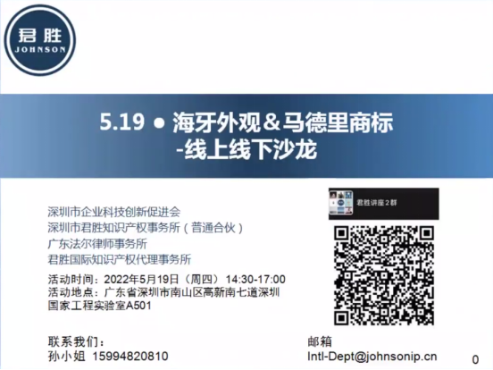 2022年5月19日下午2点半, 海牙外观&马德里商标知产沙龙讲座正式开始,此次讲座主要探讨的是关于海牙协定和马德里协定的相关知识;由世界知识产权组织(WIPO)中国办事处顾问、海牙体系专家吕国良老师和深圳市君胜知识产权代理事务所国际部商标王经理主讲。