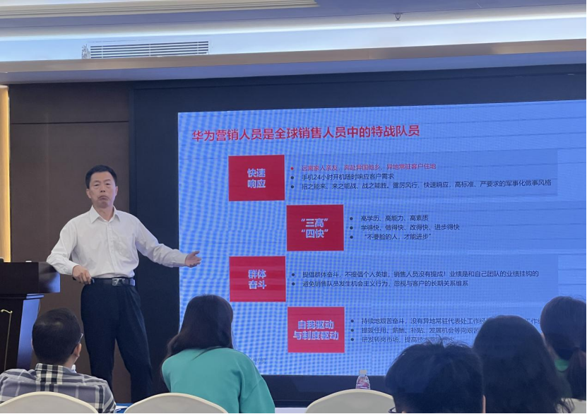 第一位分享嘉宾是曾在华为工作多年并出版了《华为规模营销法》一书的陈伟君老师。陈老师根据自身对华为营销战略、战术和方法的深刻理解,向参会者讲述了华为营销的文化、组织、流程IT和运作机制。他将管理架构、流程与IT支撑的管理体系与对人的管理和激励机制相结合,全面、系统、深入地阐述了营销文化和队伍建设、组织运作管理、客户关系管理、营销体系流程化建设等企业关心的核心问题。通过大量的案例,他向参会者展示了作为国内高新产业领头羊的华为在营销方面的实践成果,让参会者对华为营销策略以及管理体系有更深层次的理解,为自身以及企业发展提供借鉴和参考。