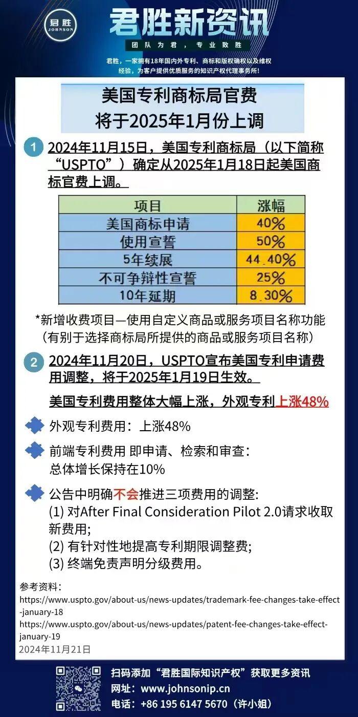 资讯 | 美国专利商标局官费将于2025年1月上调
