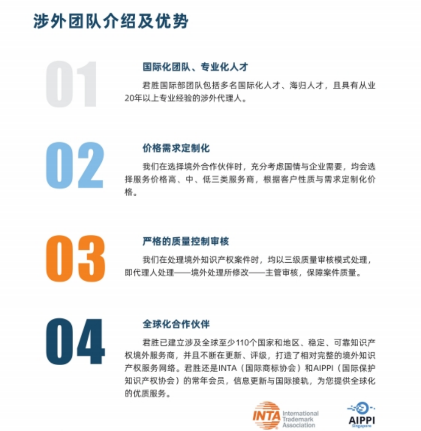 作为一家由中国政府授权、国家知识产权局批准的知识产权代理机构,君胜所提供的服务涵盖知识产权创造、运用、管理、保护等各个环节,包括国内外专利、商标、版权代理,专利挖掘与拓展、发明创新能力提升等知识产权培训,知识产权顾问咨询和法律诉讼,专利技术的转让中介服务等;其中专利代理服务涵盖机械、通讯、电子、生物、化学等领域。