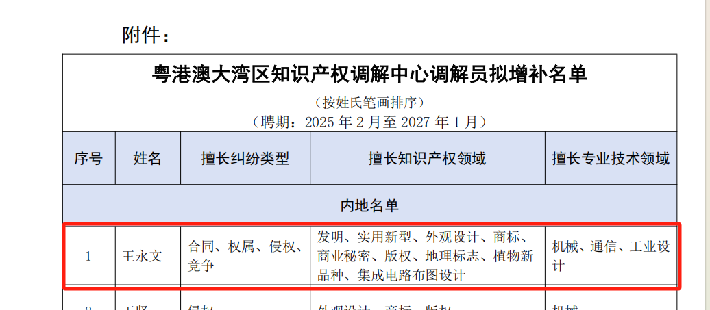 根据粤港澳大湾区知识产权调解中心最新公示,经严格遵循调解员选拔机制,通过公开征集、个人自荐/单位推荐、资格审查等规范流程,2025年度拟增补78名专业调解员。君胜知识产权创始合伙人王永文律师凭借深耕知产领域二十余载的专业积淀荣誉入选。