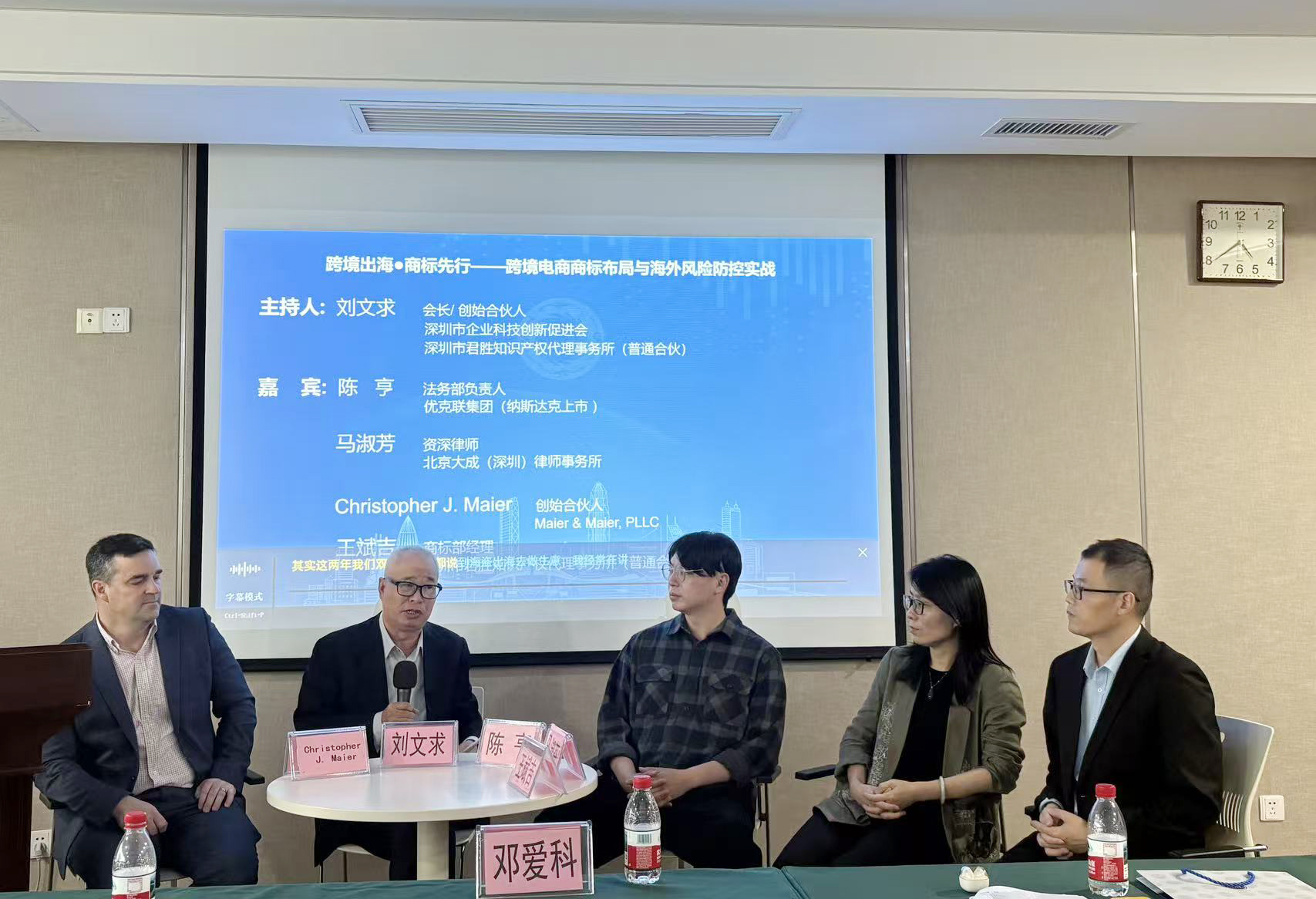 圆桌讨论环节将活动推向高潮。由深圳市企业科技创新促进会会长、深圳市君胜知识产权代理事务所(普通合伙)刘文求先生担任主持,与 Christopher J. Maier先生、北京大成(深圳)律师事务所资深律师马淑芳女士、优克联集团法务部负责人陈亨先生以及王斌吉经理共同探讨《跨境商标侵权纠纷的现场应对与长效机制构建》这一议题。各位专家结合自身领域,从国际规则、司法实践、企业内控、代理实务等多维度,深入探讨了构建跨境商标风险长效防控体系的路径与方法,其见解精辟,互动热烈,获得了与会企业代表的高度共鸣与积极反馈。