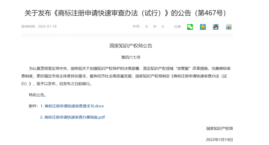 为认真贯彻落实党中央、国务院关于加强知识产权保护的决策部署,落实知识产权领域“放管服”改革措施,完善商标审查制度,更好满足市场主体差异化需求,服务经济社会高质量发展,国家知识产权局制定《商标注册申请快速审查办法(试行)》,现予以发布,自发布之日起施行。