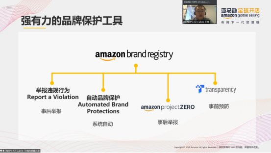 第二位嘉宾是来自Amazon Brand Protection & Success 团队的高级业务经理-王琦,他的演讲主题是“如何保护您的品牌权利:亚马逊品牌保护工具解析”。近几年,亚马逊关于侵权的案件越来越多,那么如果遇到这种情况,我们能做的事情有什么呢?王经理给我提供了三种不同方案:1.直接举报违规行为(report a violation),亚马逊平台允许知识产权所有人及其代理人将涉嫌侵权知识产权的行为通知平台;2.利用“Amazon Project Zero”系统,该系统是利用亚马逊和品牌的综合优势,通过自动保护、自助式假冒商品移除和商品序列化三个功能将假冒商品的数量将至为零;3.利用“Transparency”透明计划,跨境企业加入Transparency后,会被分配到专属的代码,在加入亚马逊的时候,该平台仅接受带正品代码的商品入库,自配送的卖家也必须提供正品的代码才可以销售。