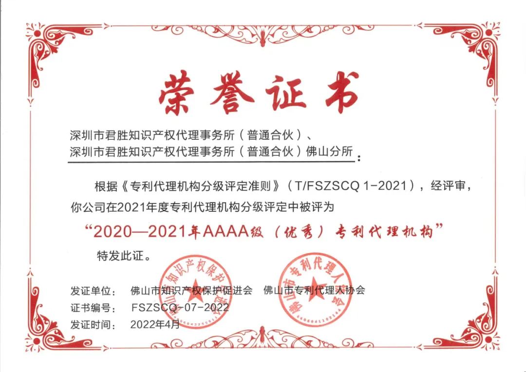 深圳市君胜知识产权代理事务所、深圳市君胜知识产权代理事务所佛山分所凭借团队多年专业的知识产权服务经验,在2021年度专利代理机构分级评定中被评为“2020-2021年AAAA级(优秀)专利代理机构”。