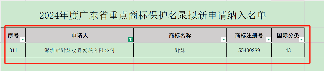 (公示链接:关于2024年度广东省重点商标保护名录的公示)我所代理的深圳市野妹投资发展有限公司“野妹”商标纳入保护名录。