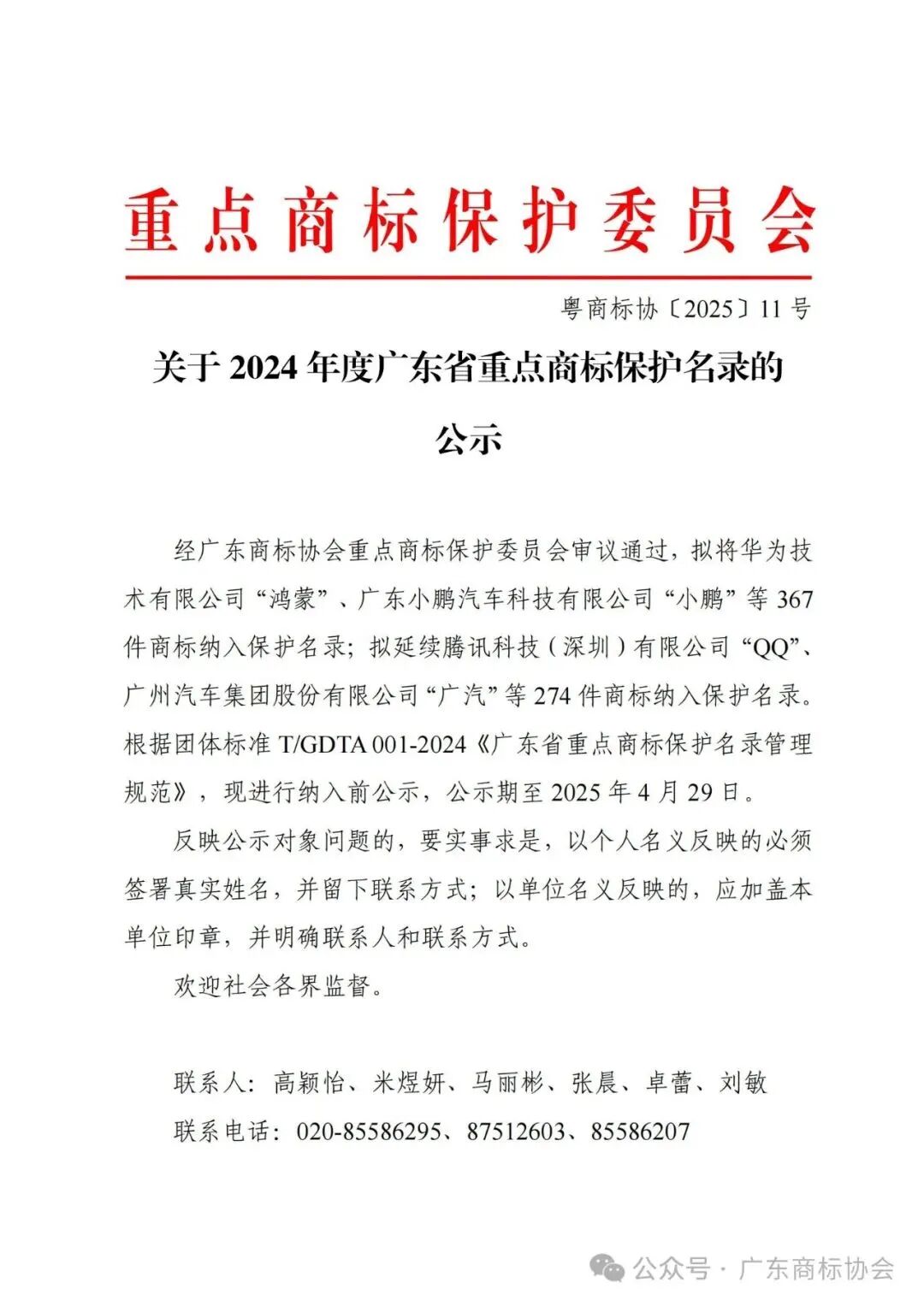 近日,经广东商标协会重点商标保护委员会审议通过,拟将华为技术有限公司“鸿蒙”、广东小鹏汽车科技有限公司“小鹏”等 367件商标纳入保护名录;拟延续腾讯科技(深圳)有限公司“QQ”广州汽车集团股份有限公司“广汽”等274件商标纳入保护名录。根据团体标准 T/GDTA 001-2024《广东省重点商标保护名录管理规范》,现进行纳入前公示,公示期至2025年4月29日。