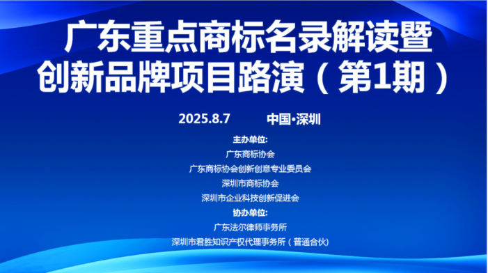 2025年8月7日下午,由广东商标协会及其下属的创新创意专业委员会、深圳市商标协会、深圳市企业科技创新促进会联合主办,深圳市君胜知识产权代理事务所、广东法尔律师事务所协办的“品牌创新力·智造新未来”广东名录解读暨创新品牌项目路演(第1期)活动,在深圳市南山区国家工程实验室大楼A栋503圆满举行。此次活动旨在推动广东省企业品牌创新与知识产权保护的深度融合,为科技型及创意型企业提供创新赋能与知识产权保护的一体化解决方案。